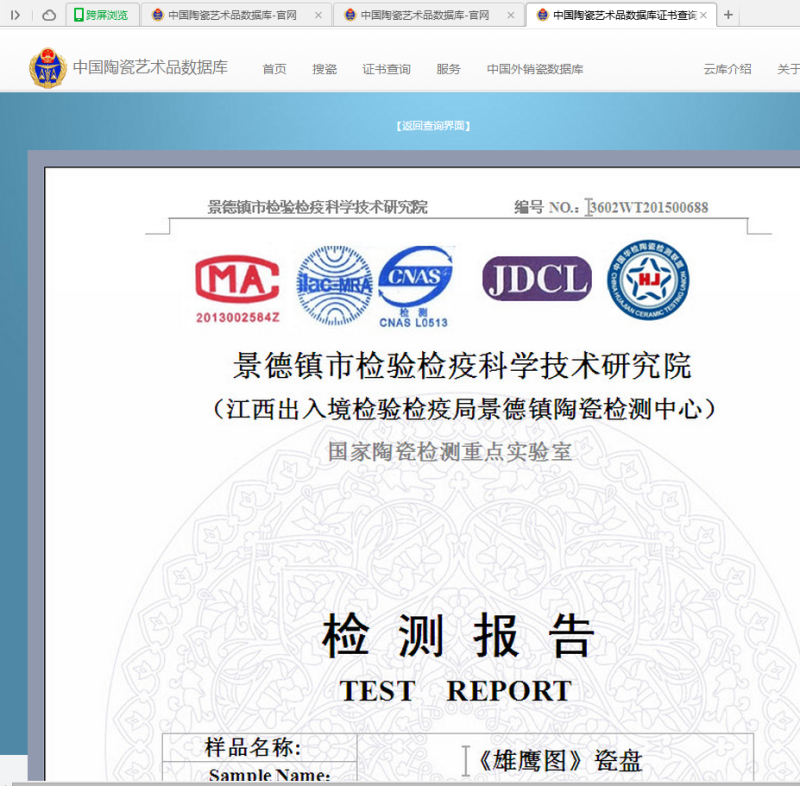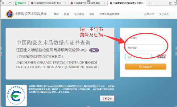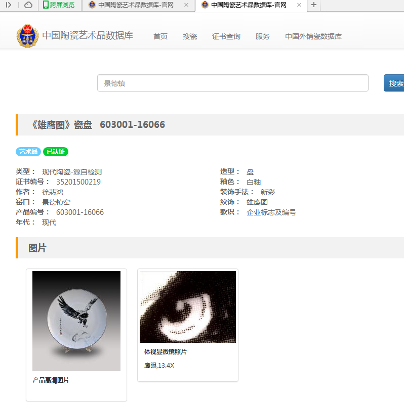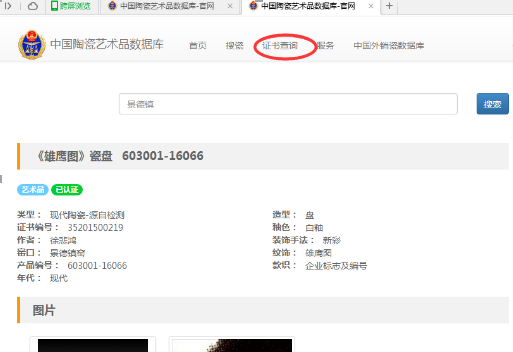 2、進(jìn)入中國陶瓷藝術(shù)品數(shù)據(jù)庫官網(wǎng)頁面,在圖二的選中區(qū)域輸入圖一中產(chǎn)品編號后五位數(shù)字“16066”,即可檢索到該編號產(chǎn)品可供對外查詢信息(每個產(chǎn)品對外可查詢一個體視顯微鏡照片數(shù)據(jù))